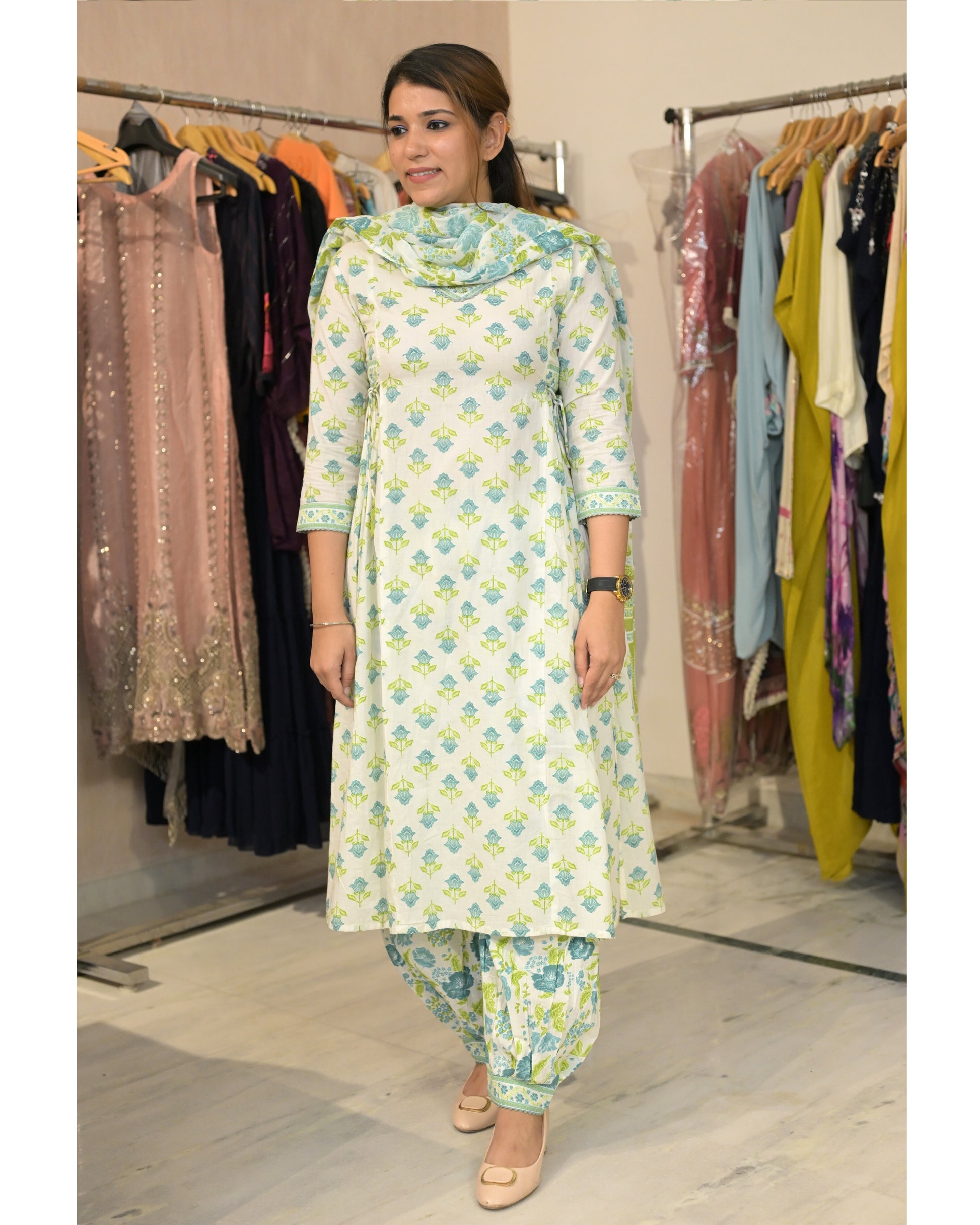 Pure cotton stiched suit set which includes afgani salwar and cotton dupatta